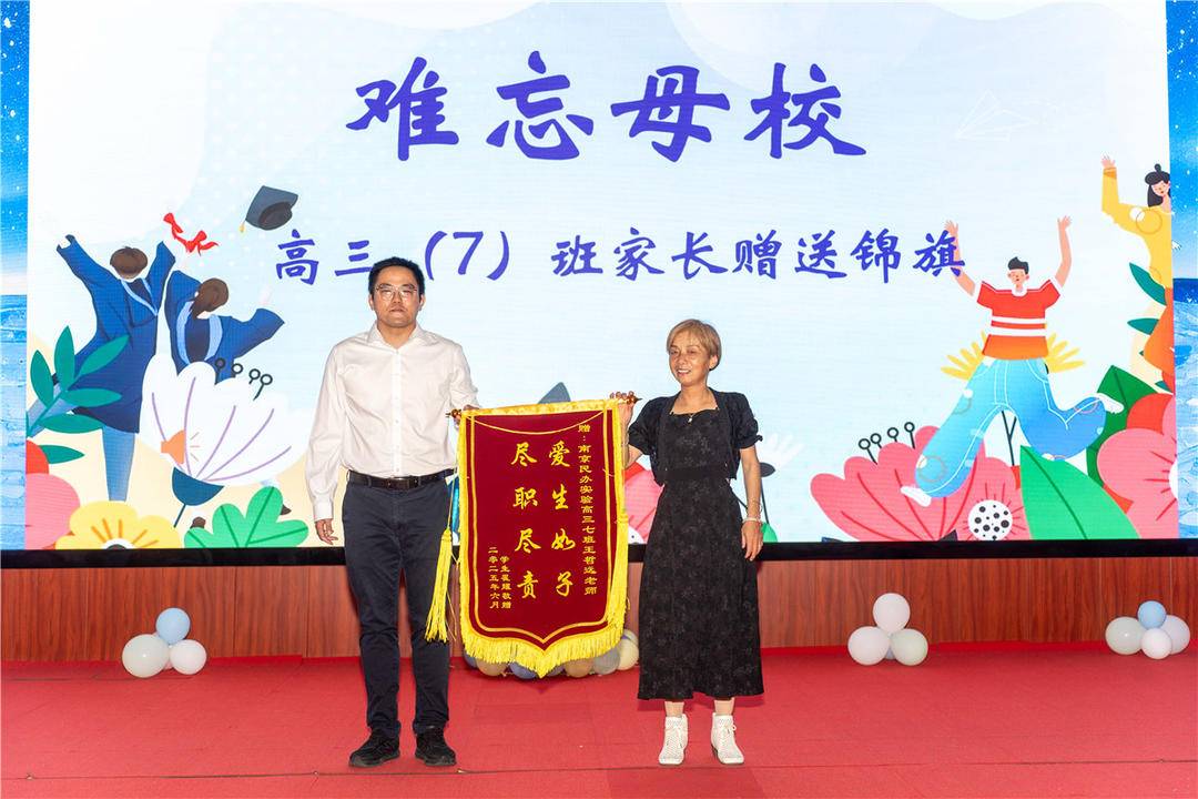 一中实验学校校长尤小平为同学们颁发毕业证书。典礼上,同学们向校领导、班主任和任课教师献花,表达自己的感恩之心。
