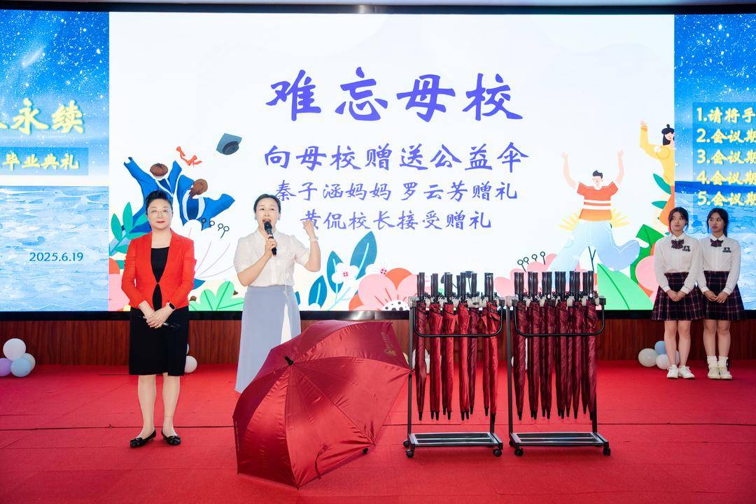 高三(6)班秦子涵家长罗云芳代表全体家长向学校赠送纪念品——20把公益雨伞。执长校长黄侃代表学校接受赠礼。她动情地说:“每到毕业季,高三的学哥学姐们总会给母校送上精心准备的20把公益雨伞。这20把紫色的雨伞,也许看起来不是那么耀眼,也不是多么贵重,它朴实无华,却又那么地贴心周到,让人不由得心生一份感动。这20把伞,不仅意味着成长和分别,还传达了他们对学弟学妹的无限关怀和爱护,更寄托了 ‘随手公益,传递美丽’的热切愿望与期盼。这20把伞,撑开了风雨中的一片静谧与美好,也撑开了实验学子践行服务意识、弘扬公益精神的襟怀和天空。”